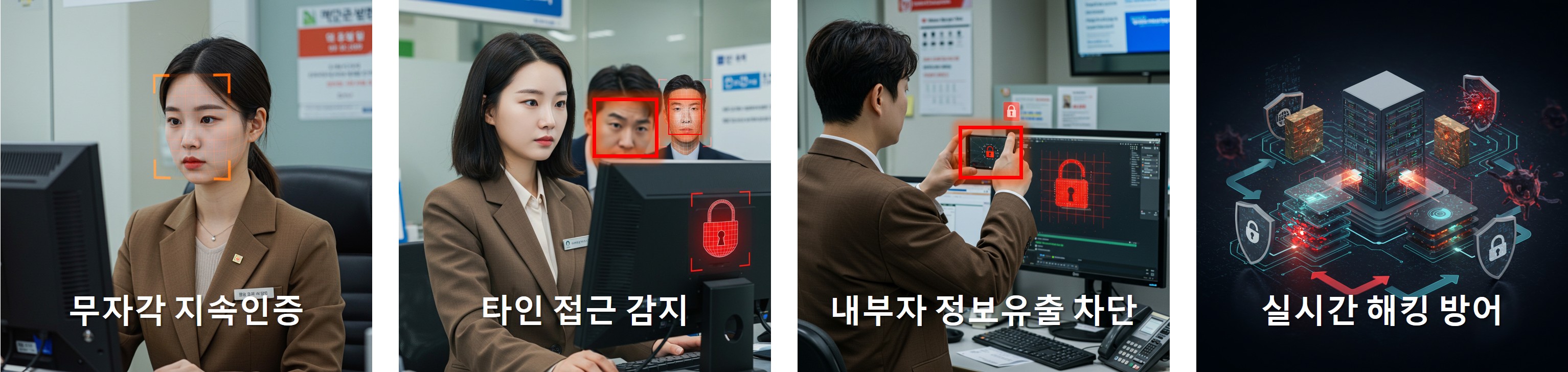 시선AI의 SEEU ON IdP(씨유온아이디피)는 금융권 해킹 방어 및 내부통제, 결재 보안 등에 최적화된 얼굴인식 기반 통합 인증 솔루션입니다. AI 기반 얼굴인식 기술을 바탕으로 무자각 지속인증 기능을 제공하는 표준 연계 어댑터를 통해 사용자 인증 이후에도 지속적으로 사용자의 상태를 검증하고 이상행위를 탐지합니다.