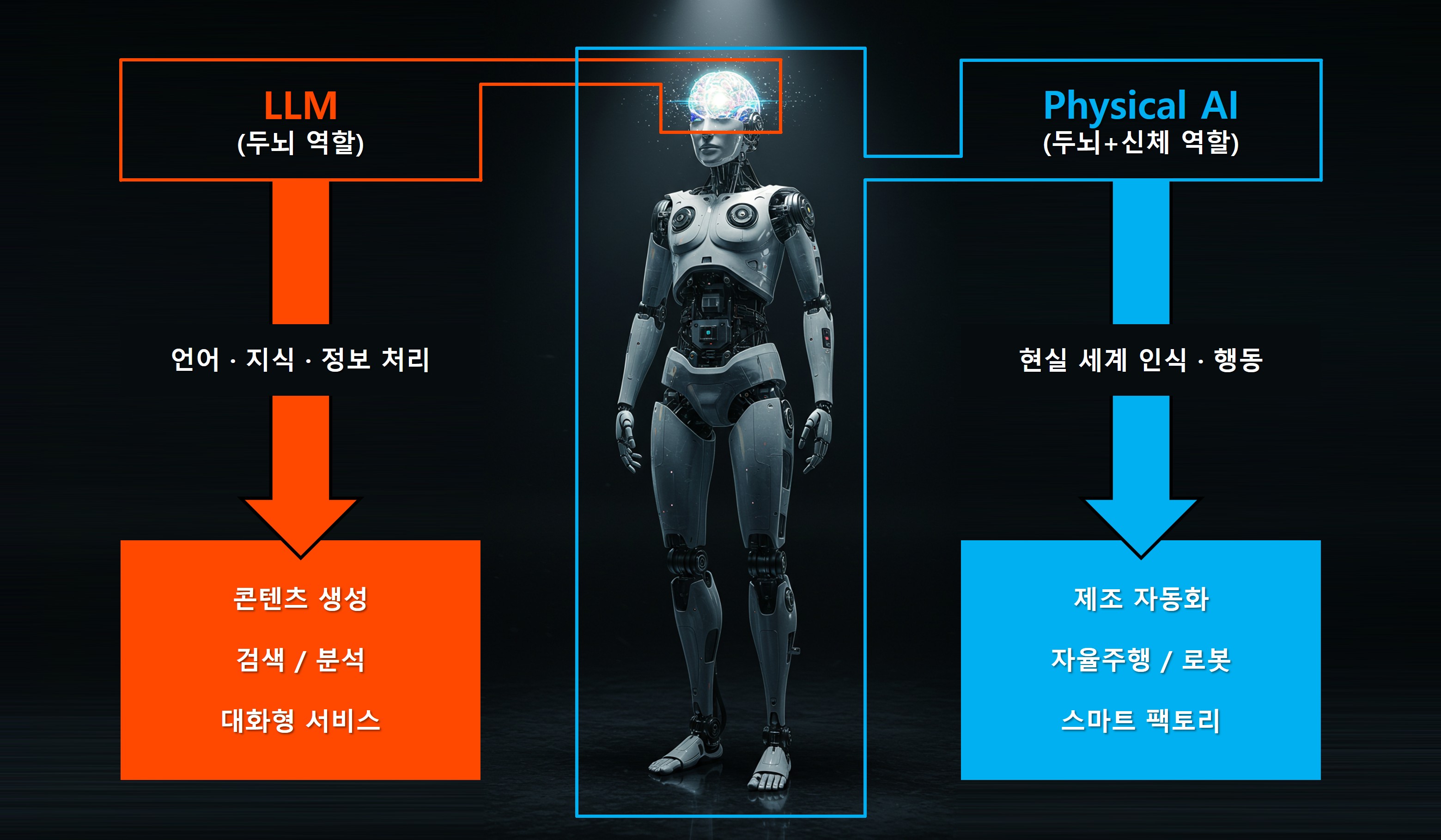 '피지컬 AI(Physical AI)'란 로봇, 센서, 스마트기기와 결합해 현실 세계의 물리적 환경을 지각하고, 판단하며, 실제 행동으로 피드백을 실행하는 인공지능을 의미합니다. 즉 '물리적 세계와 직접 상호작용하는 인공지능'이라고 정의할 수 있습니다. 단순히 데이터를 분석하거나 텍스트, 이미지를 생성하는 수준을 넘어, 센서, 로봇, 엣지 디바이스 등을 매개로 실제 공간에서 '인지→판단→행동'으로 이어지는 전 과정을 수행하는 AI입니다.